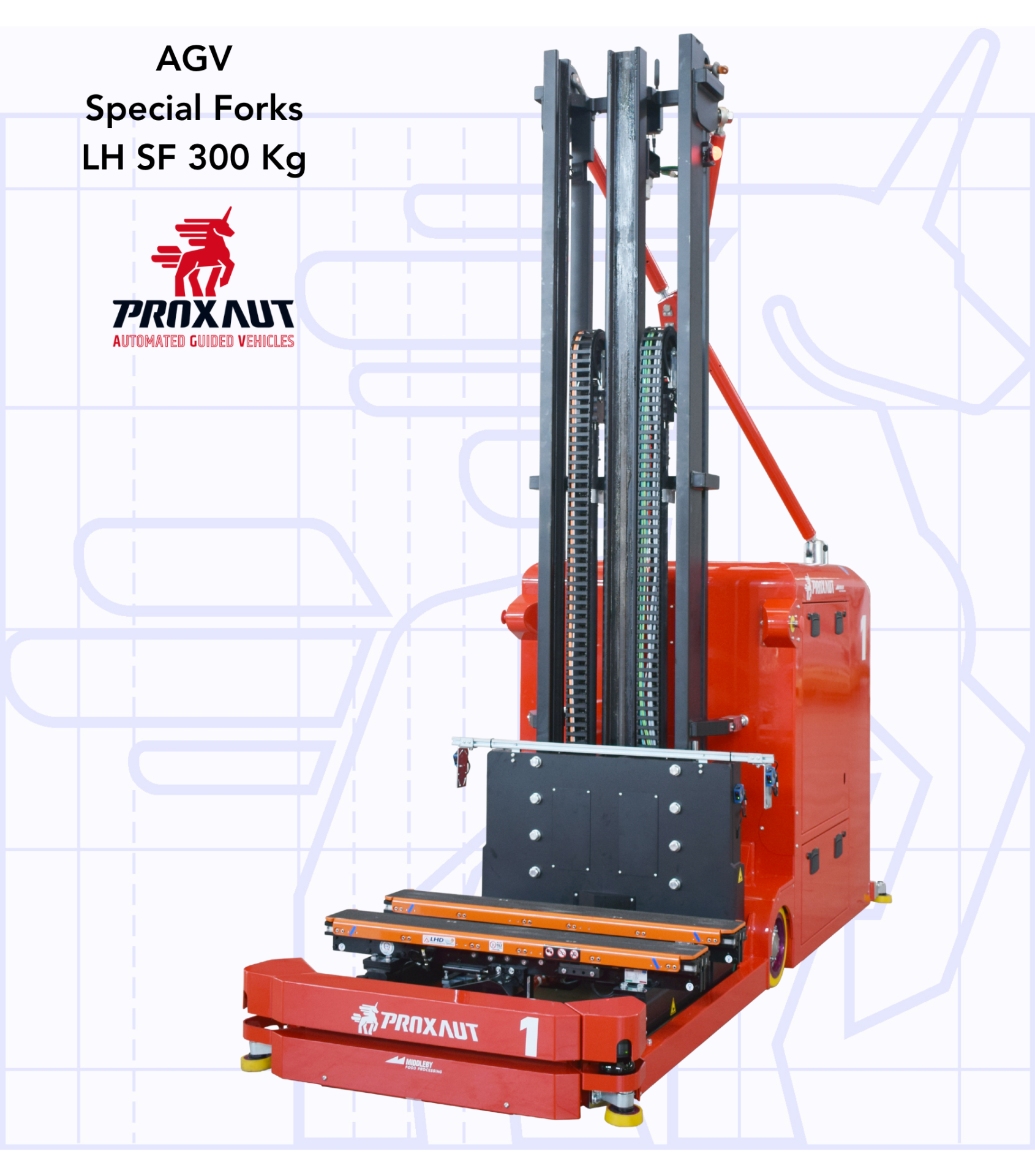 Carrello elevatore AGV a guida autonoma con forche speciali bilaterali per il trasporto di contenitori metallici.