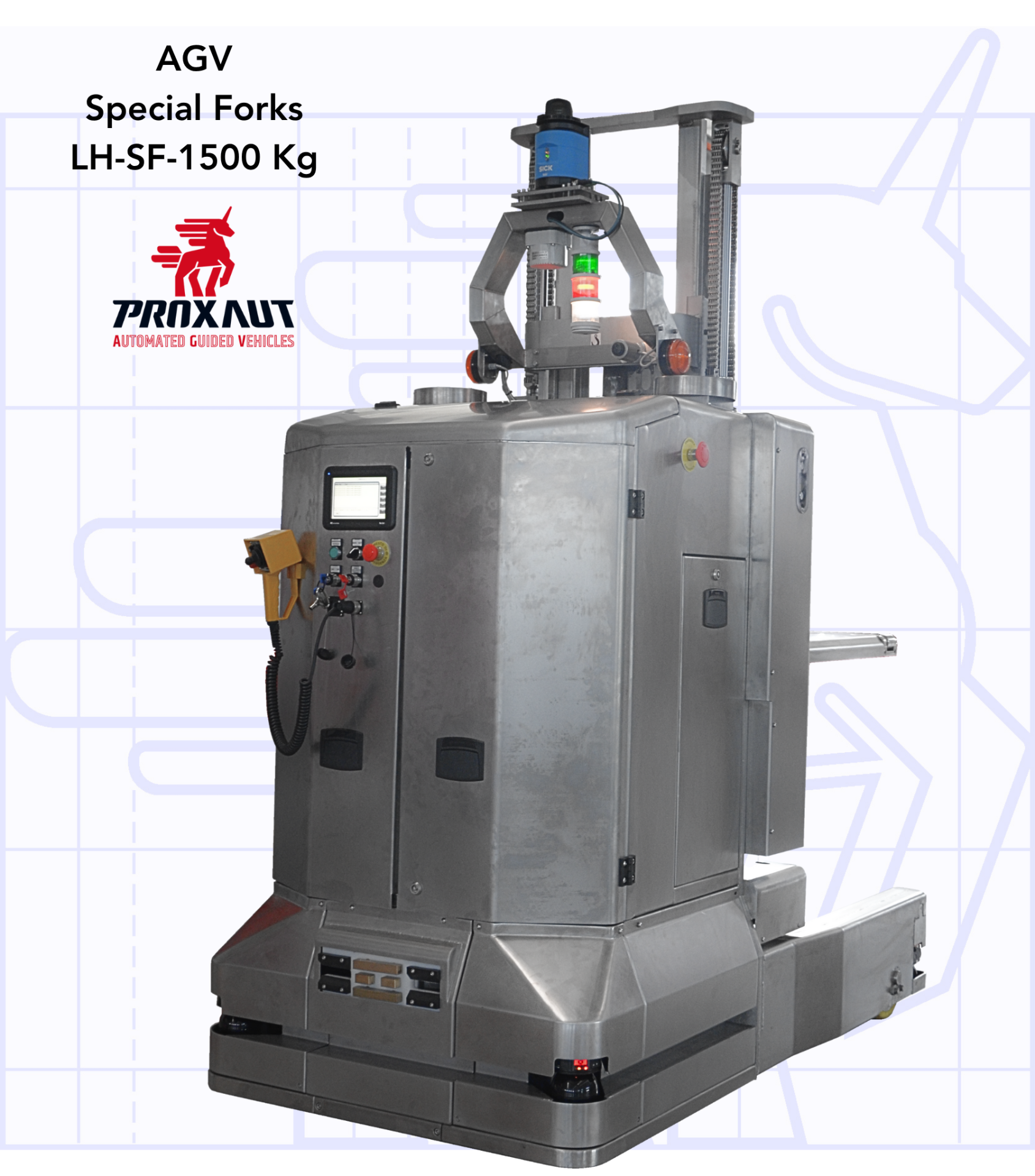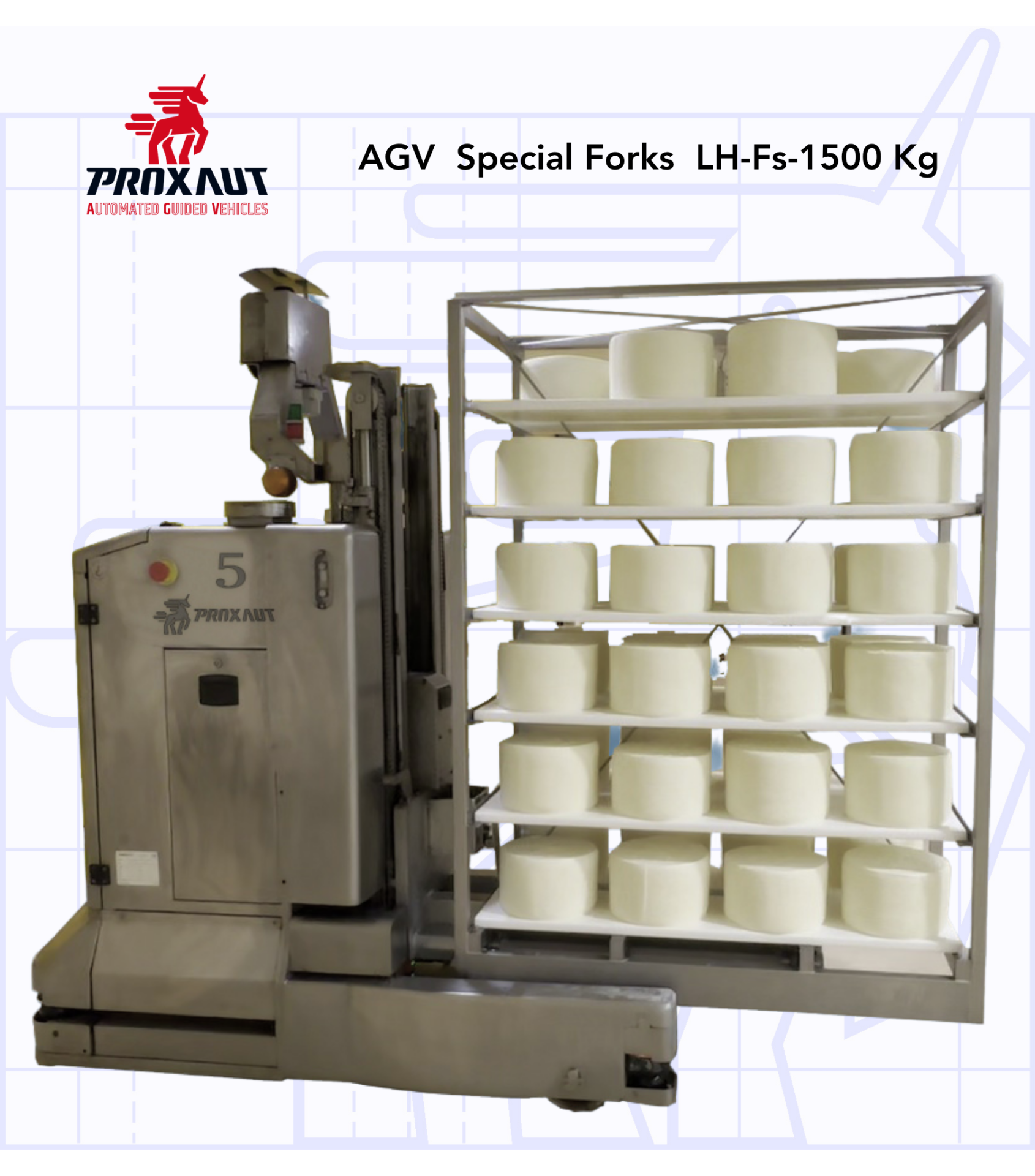 Self-driving AGV forklift with special forks for transporting cheese wheels inside the maturing rooms.