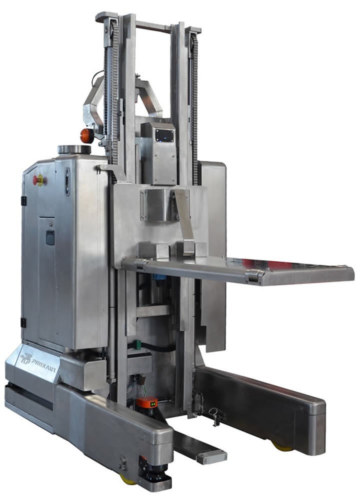 AGV monohorquilla: Se trata de una solución de carga con una única superficie de apoyo cuya anchura puede variar según el tipo de UDC. Es ideal para cargar cajas, carros con ruedas, plataformas, cubas, etc., y también está disponible en acero inoxidable AISI 304 para productos alimentarios frescos.